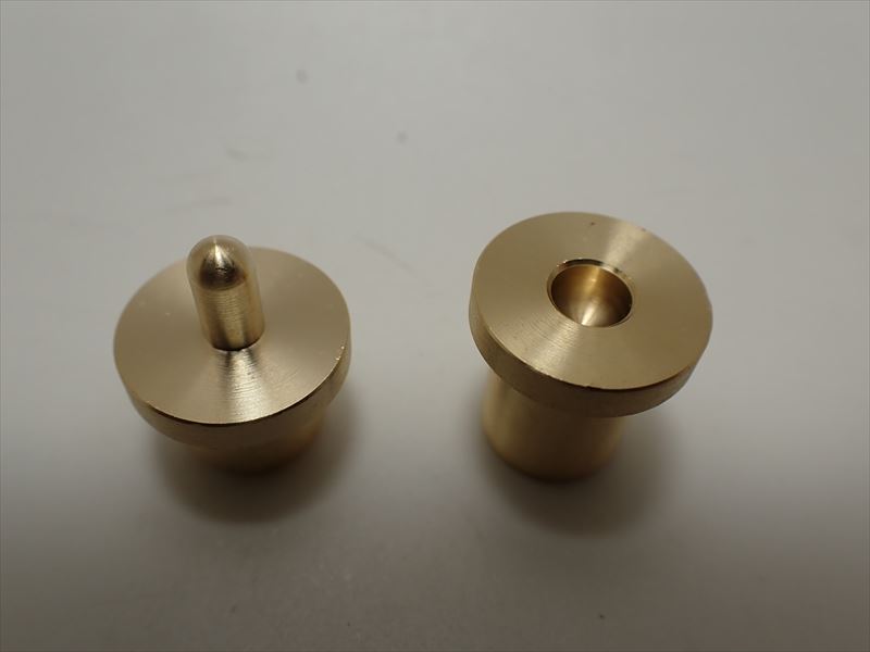 Funnel Mesh Mold フェンネルメッシュ金型 真鍮メッシュ(金網)やステンレスメッシュ(金網)を使い自作のファンネルメッシュが製作できる金型となります。 【ファンネルメッシュを作る前の本体の準備】 本体台座 上下2個セットに対して ビットサイズ(凹凸)のいずれかを選びます 本体に上下の穴にビットをセットし 上になるのが凸型となりますので 本体横のネジ穴より付属のイモネジを入れ六角レンチで凸型を固定します。 これでセット完了となり凹型の上に網(メッシュ)を置き 上部の凸型で網を押し込みます この金型を使い金網をファンネルの形を再現できます。 【ファンネルの作り方】 金型本体(2個)にオス型とメス型をセットします。 金網を2cm×2cmに切ります。 オス型(上)とメス型(下)の間にメッシュ(金網)を挟みオス型を手のひらを使いメス型に押し込みます。 グリッグリッと下まで押し込みオス型を取り メッシュを引っ張り出すと半円のファンネルメッシュができます。 半円はやや長めの形になりますので 半円(ファンネル)の大きさにブリキばさみ等を使いカットしてください。 ※ステンレスは真鍮より硬い素材となり目の粗いステンレスメッシュは押し込むことができませんのでご注意ください。 ※【1/43用の金型は強く押し込むとメッシュを貫通してしまい穴が開いてしまします 力加減に十分にご注意ください。】 :真鍮メッシュ適合サイズ 50/ms~120/ms :ステンレスメッシュ適合サイズ 70/ms~120/ms