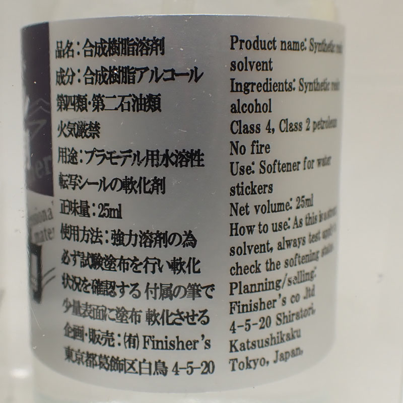 ●硬いデカールを軟らかくします ●ひと塗りして30秒後に綿棒等で押し付けながらなじませます ●少ない場合はさらにひと塗りし同作業を行います ●強力なので必ずテストしてからご使用ください ●水で希釈する事で強度を変えられます